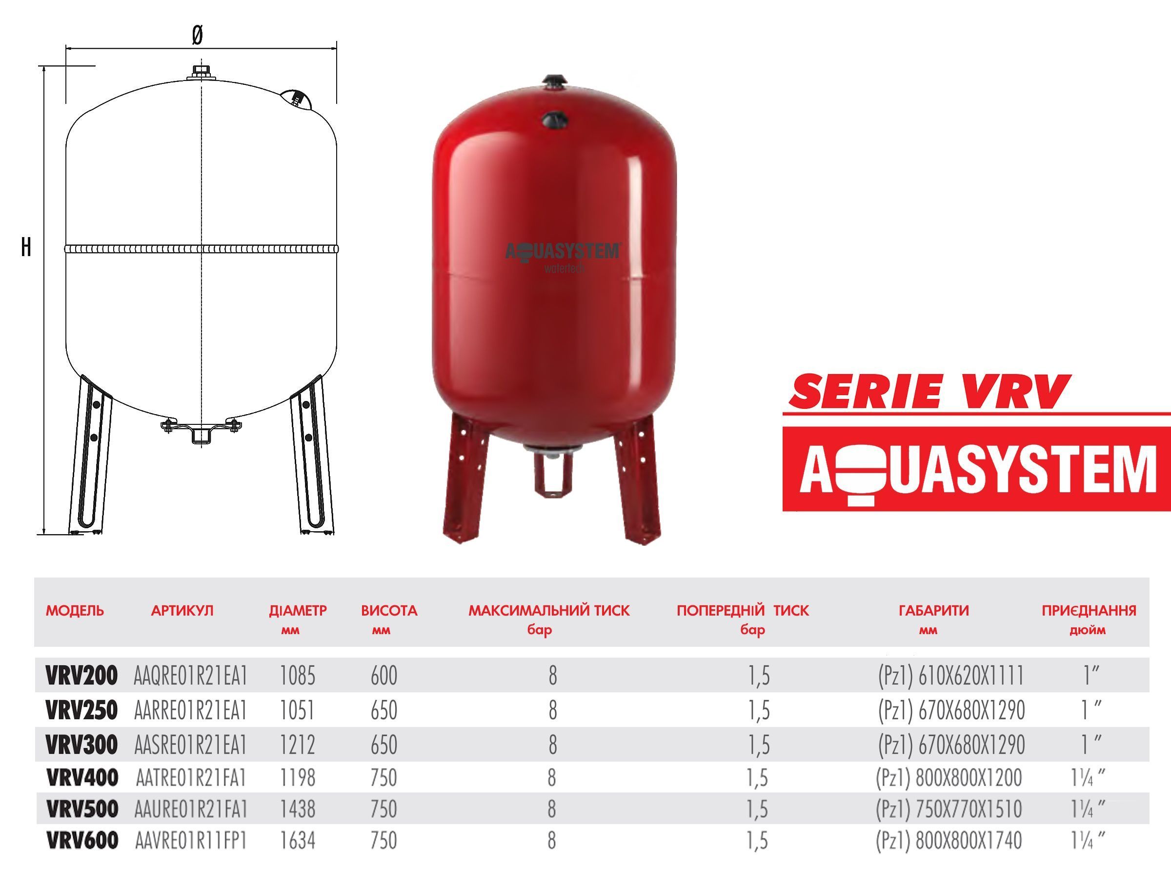 Aquasystem VRV 500 - расширительный бак на 500 литров с заменяемой мембраной, который применяется в закрытых системах отопления и хладоснабжения для компенсации объема теплоносителя при изменении температуры жидкости (охлаждение или нагрев)