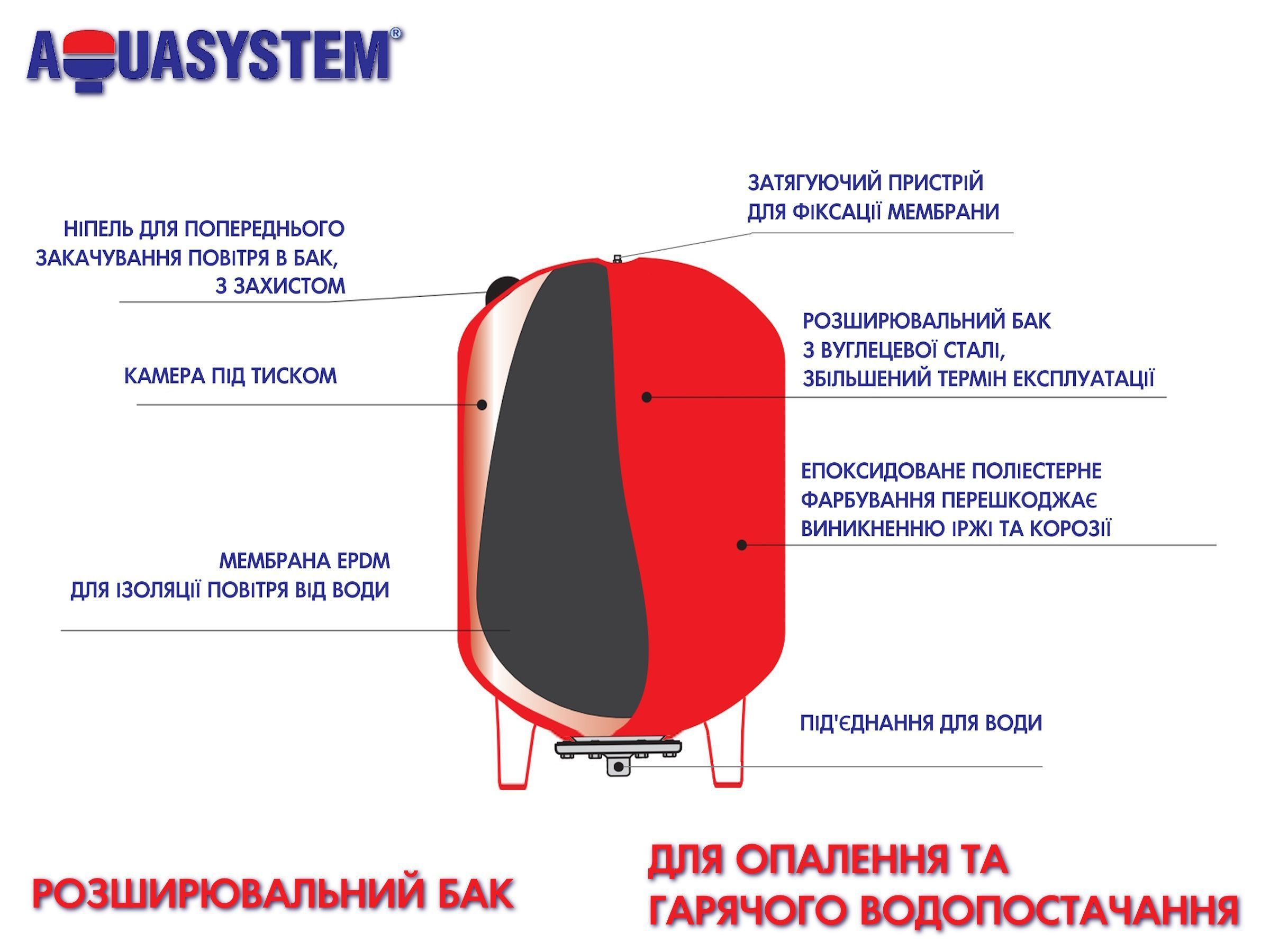 Компенсационный бак Aquasystem VRV 500 с ножками разделен мембраной на две части - камеры. Одна камера заполнена предварительно закачанным низко-инертным газом - азотом под давлением, другая часть (водяная камера) предназначена для воды. Бак имеет ножки, для установки его непосредственно на пол