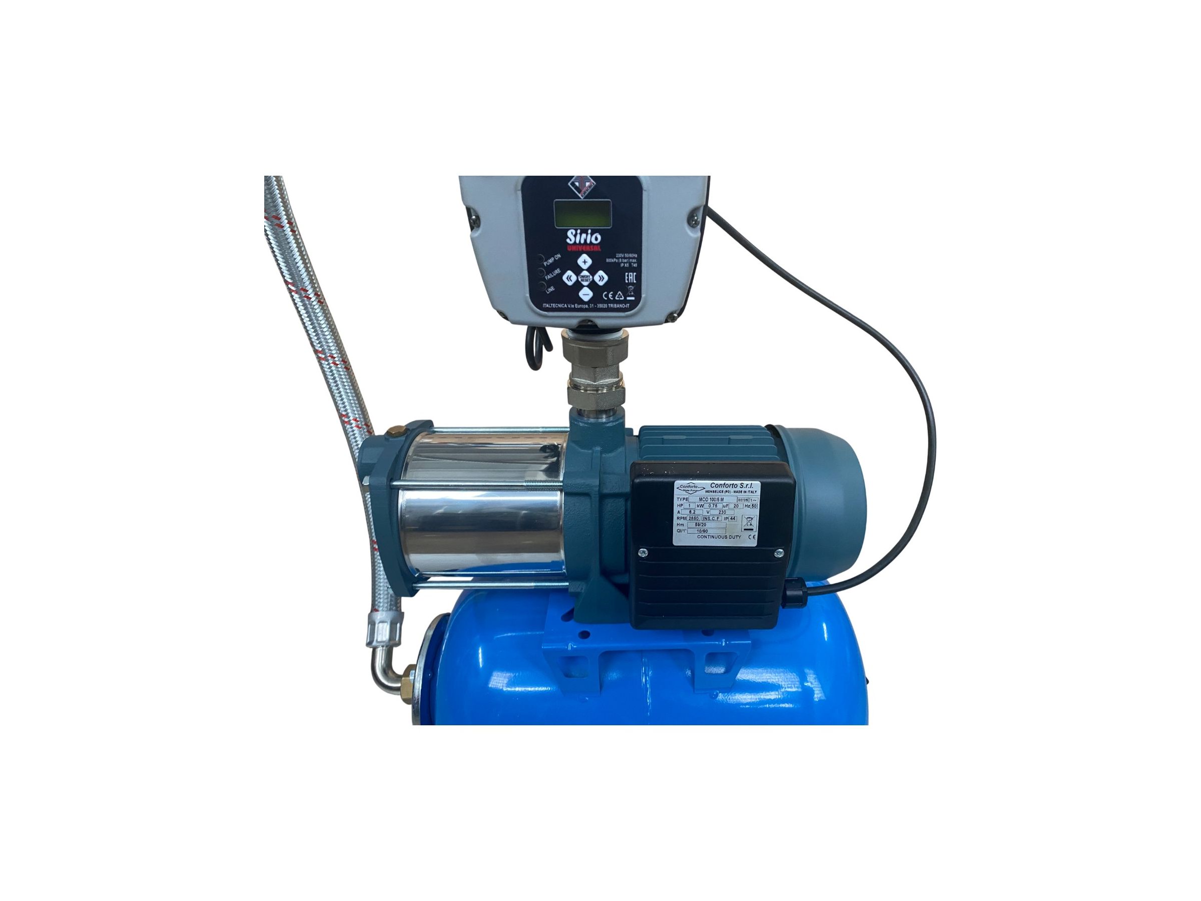 Насосная станция Conforto BS MCO 100/5-24 SIRIO комплектуется частотным преобразователем (инвертором) Sirio Universal производства Italtecnica (Италия), предназначенным для автоматического контроля работы электронасоса, а также многоступенчатым всасывающим насосом Конфорто МСО 100/5.