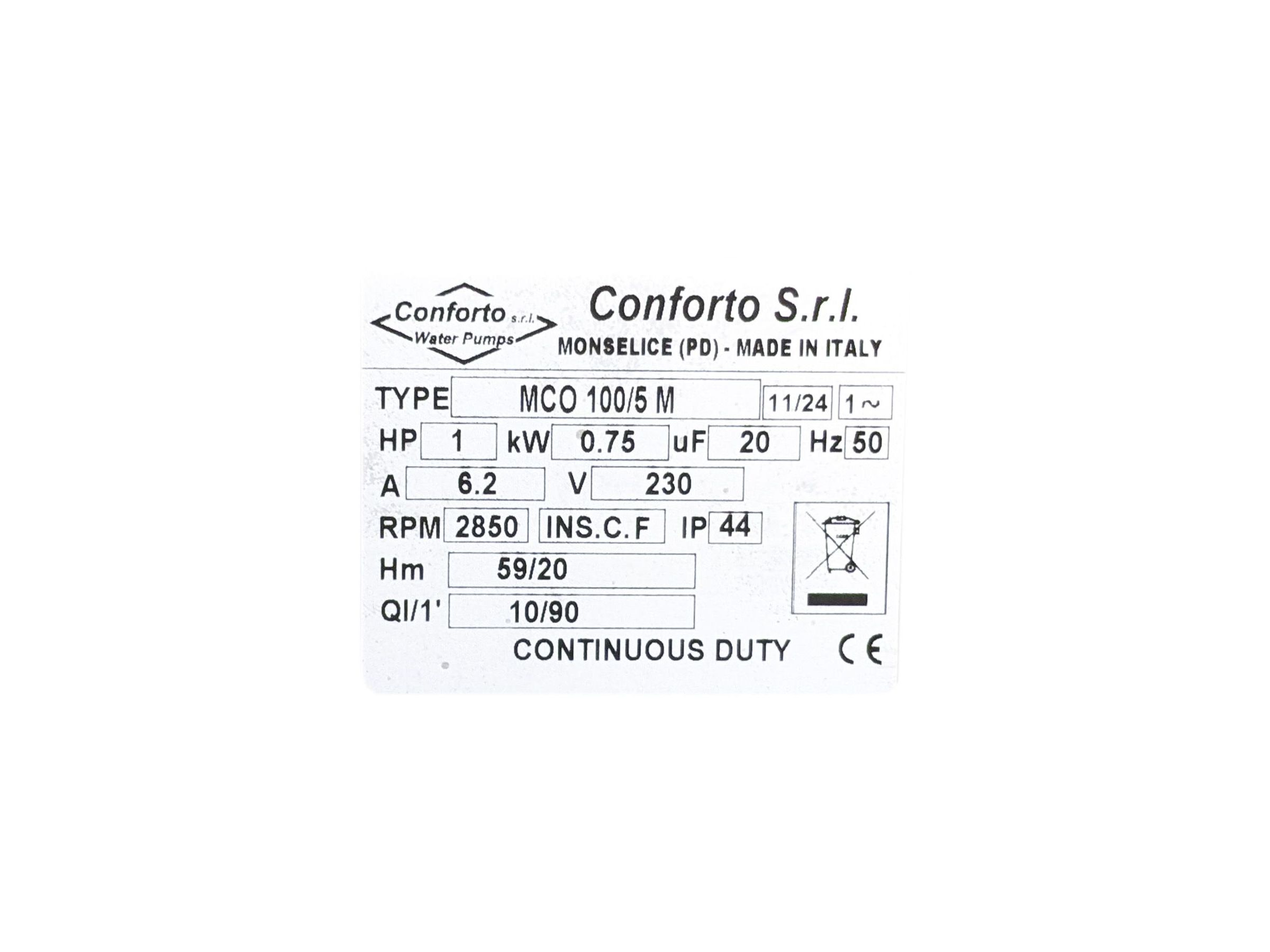 - Економія електроенергії: насос Конфорто MCO 100/5 M споживає мінімум енергії завдяки продуманій конструкції двигуна, що є великою перевагою для постійного використання.